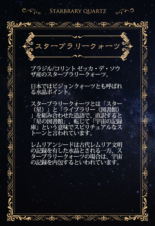 スターブラリークォーツとは「スター(星)」と「ライブラリー(図書館)」を組み合わせた造語で、直訳すると「星の図書館」、転じて「宇宙の記録庫」という意味でスピリチュアルなストーンと言われています。