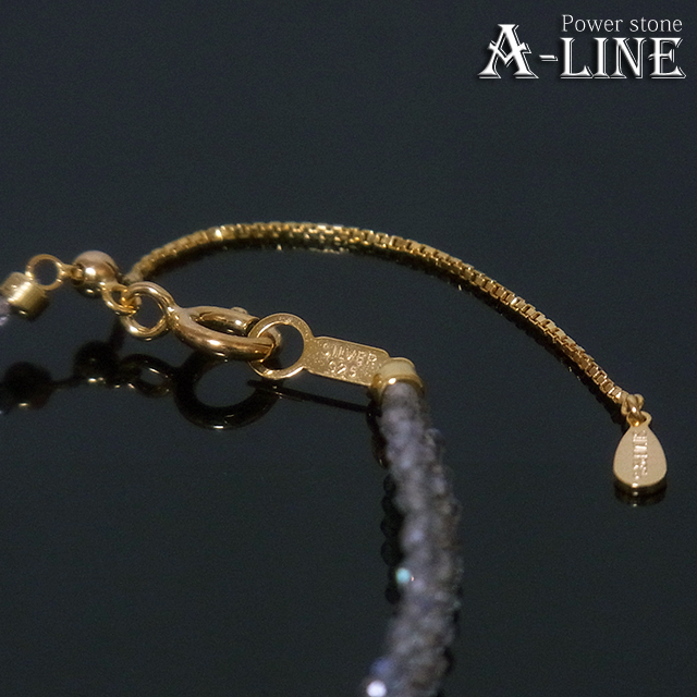 ラブラドライト・ファセット2mm、ヘマタイト・ファセット(コーティング)金色3mm、SILVER925ひき輪&スライドアジャスター金色、形状記憶超弾性ワイヤー、ワンプッシュ