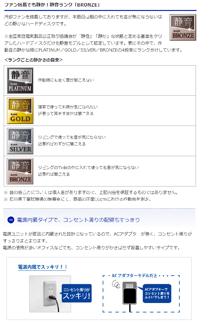 また、独自のヒートシンク構造と冷却用ファンの両方でしっかり冷却するため、ハードディスクの温度上昇を抑え、故障リスクを低減。電源内蔵タイプでACアダプターがないので、コンセント周りもすっきり配線できます。