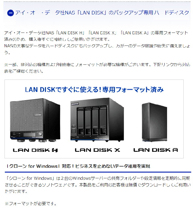 本商品は、アイ・オー・データ社法人NAS「LAN DISK H」「LAN DISK X」および「LAN DISK A」のバックアップ専用ハードディスクです。専用フォーマット済みのため、ご購入後すぐにお使いいただけます。