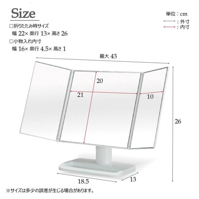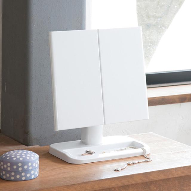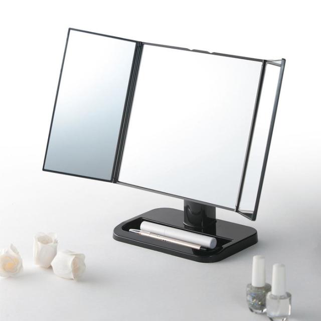 ワイドな三面鏡メイクアップミラー様々な角度を映せるのでメイクやヘアカラーに便利三面鏡だからお顔全体や横顔もしっかり映ります。収納時は扉を閉めてすっきりコンパクト、気になるホコリも防ぎます。マスカラなど転がりやすいアイテムをサッと置ける小物入れ付きです。鏡の角度は無段階に調整でき、映したいポイントで止まります。