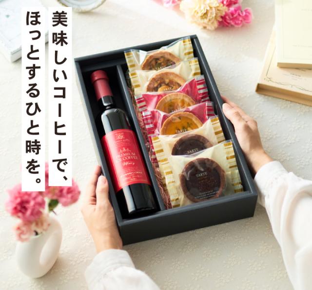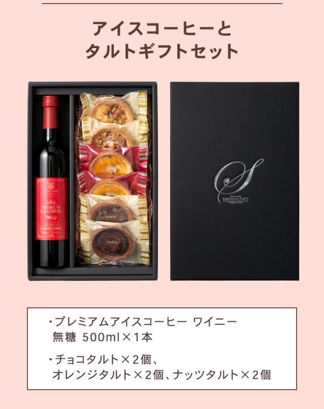| セット内容 | ・プレミアムアイスコーヒー ワイニー 無糖 500 ml ×1本(赤ラベル) ・ナッツタルト ×2個 ・オレンジタルト ×2個 ・チョコタルト ×2個 |
