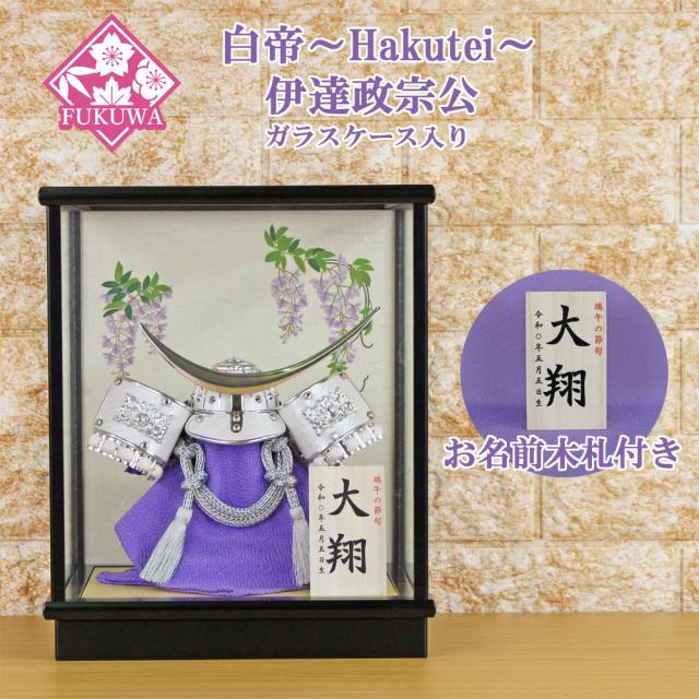 五月人形 兜飾り コンパクト おしゃれ モダン ケース 入り (白帝〜Hakutei 5号 伊達政宗公 兜 (藤) マットブラック ガラス ケース入り お名前木札付き YA504-24)端午の節句 初節句 5月人形