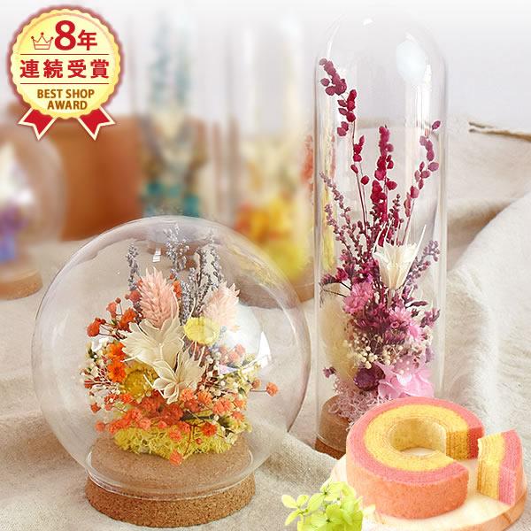 誕生日プレゼント お祝い 送料無料 お菓子 スイーツ 洋菓子 プリザーブドフラワー ガラスドーム アレンジ 雑貨 置き物 アンティーク バウムクーヘン お礼 退職祝い お供え 敬老の日 手土産 お返し ギフト おいもや