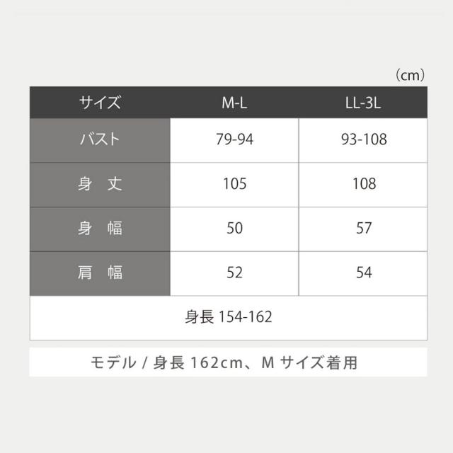■適応サイズ:身長154-162、M-L/バスト79-94、身丈105、身幅50、肩幅52、LL-3L/バスト93-108、身丈108、身幅57、肩幅54cm。モデル/身長162cm、Mサイズ着用。