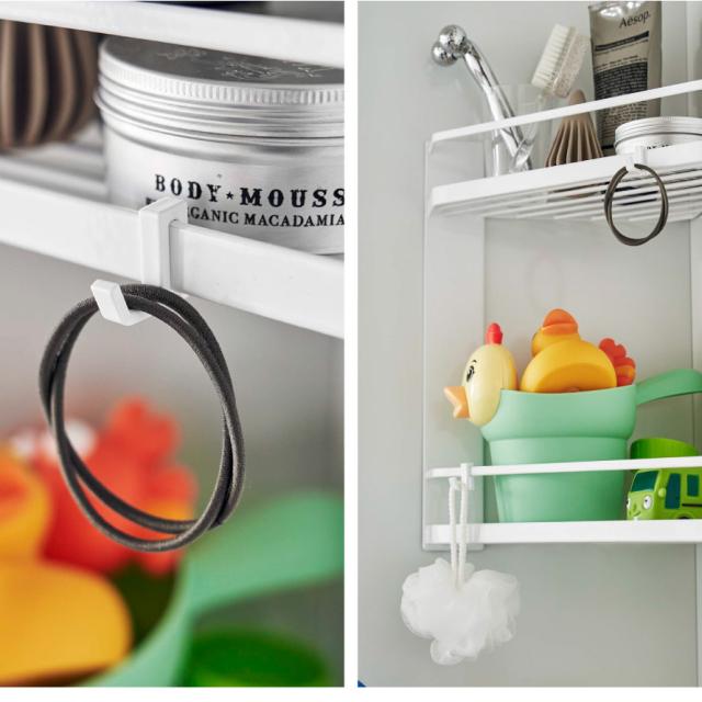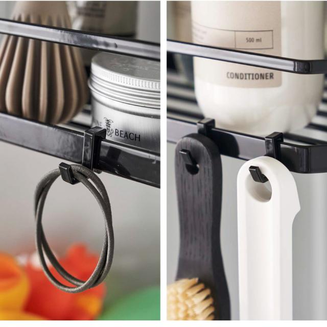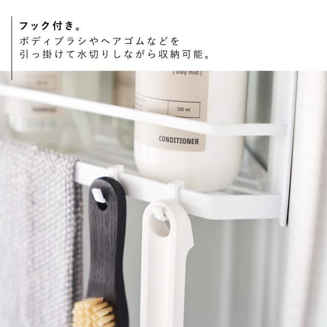 フック付きなので吊るして水切りも可能。ボディブラシやヘアゴムなどを引っ掛けて収納できます。