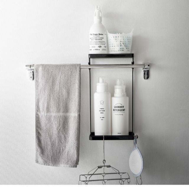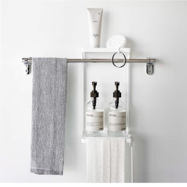 備え付けのタオルバーに差し込むだけ!タオルバーの上下の空間を有効活用できます。棚は水切れの良いスリット構造。2段式なので、用途に分けて収納できます。