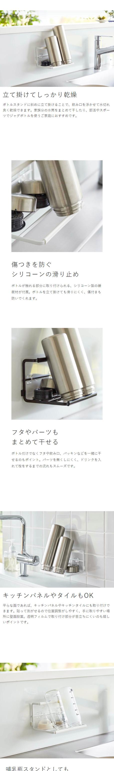 ボトル類を立て掛けて乾かせる水切りスタンド。キッチンパネルやシンク内に省スペースに設置でき、2Lサイズのマグボトルやジャグボトルも浮かせて乾燥。哺乳瓶スタンドとしても使えます。