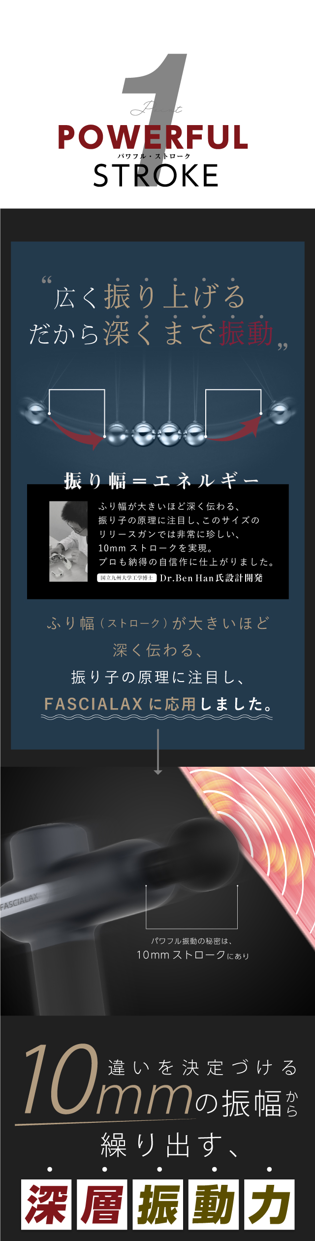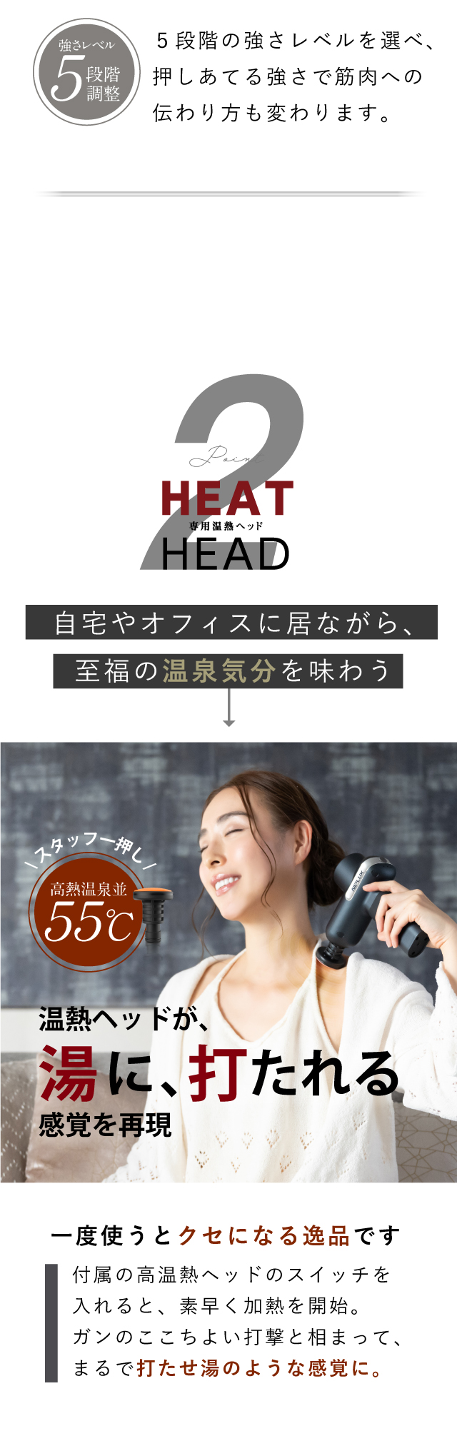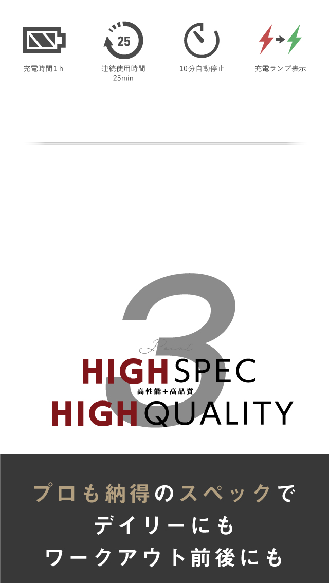 2世代変圧制御システムを採用し、1分間に最大3200回のパワフル振動が、 普段動かさない筋肉の奥深くまで届きます。