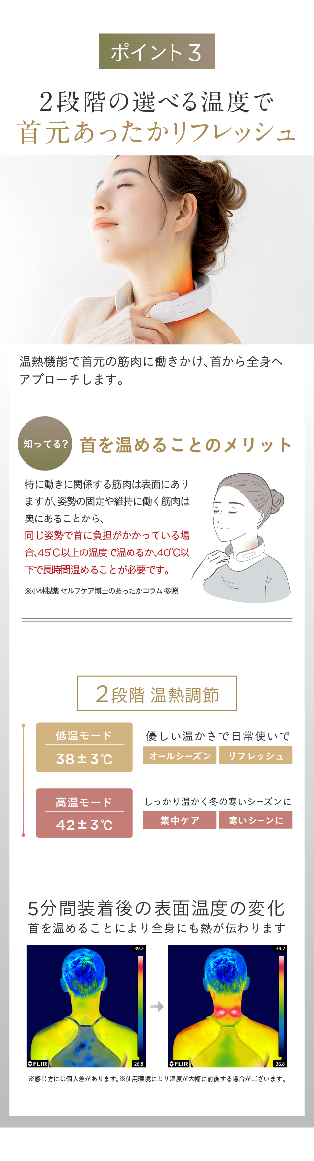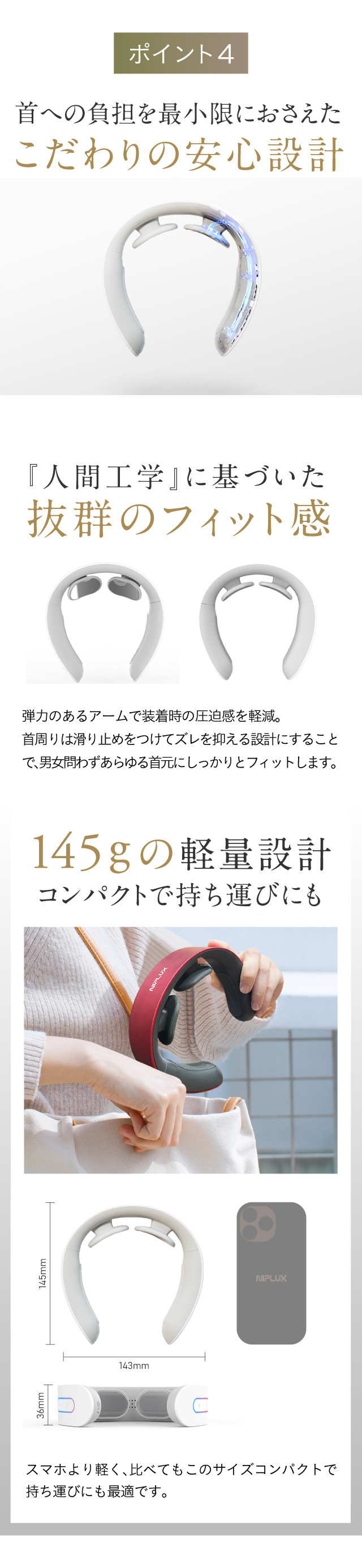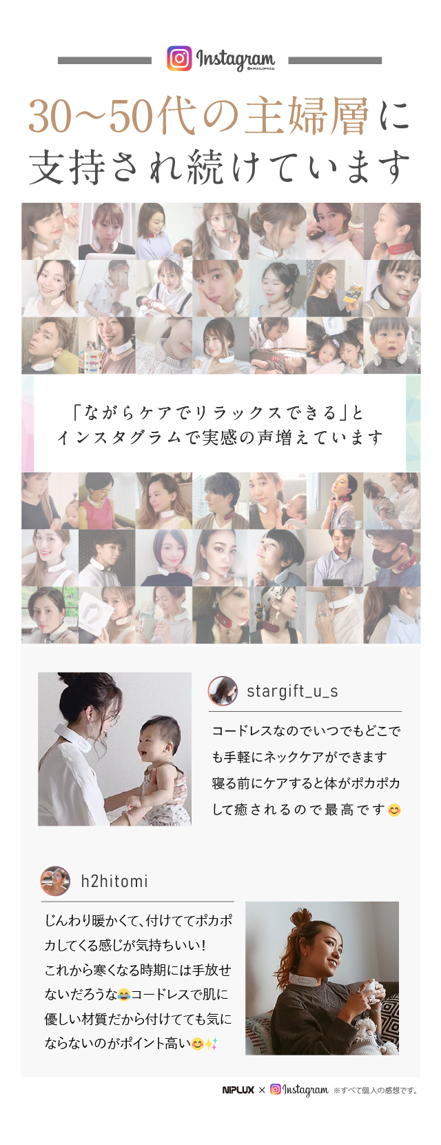 NIPLUX NECK RELAX は、浮動電極シートからの放熱で首をじんわり温めます。首・肩まわりのケアにおすすめです。
