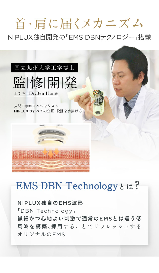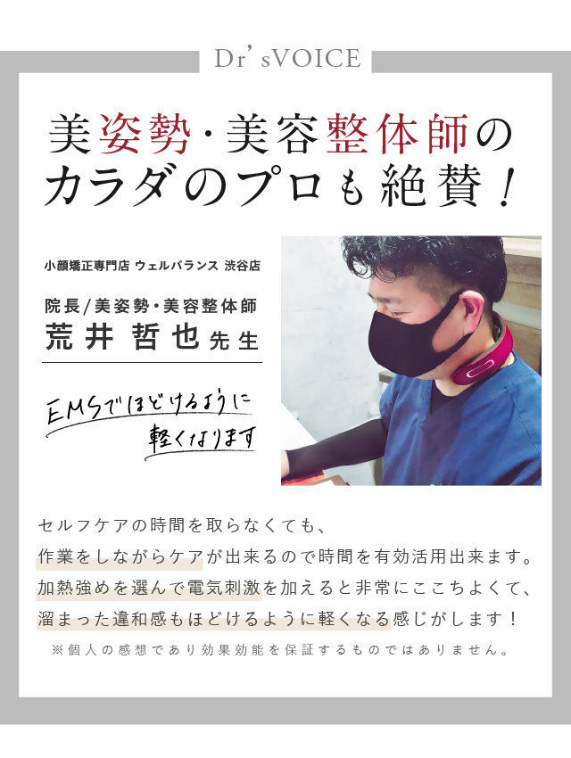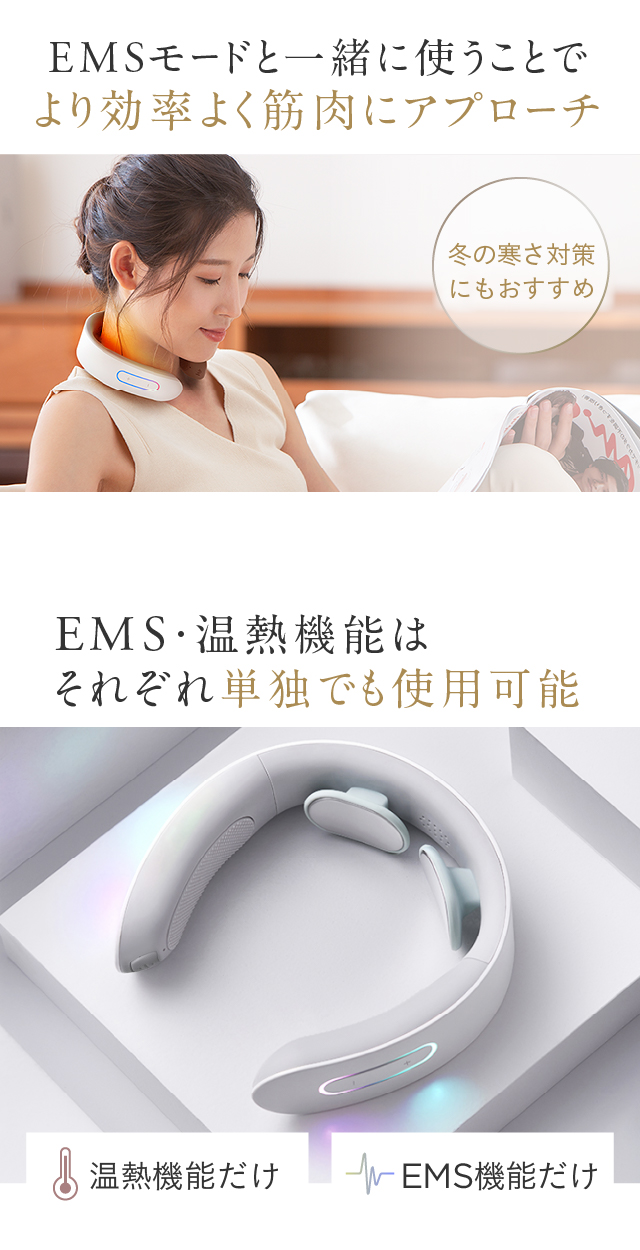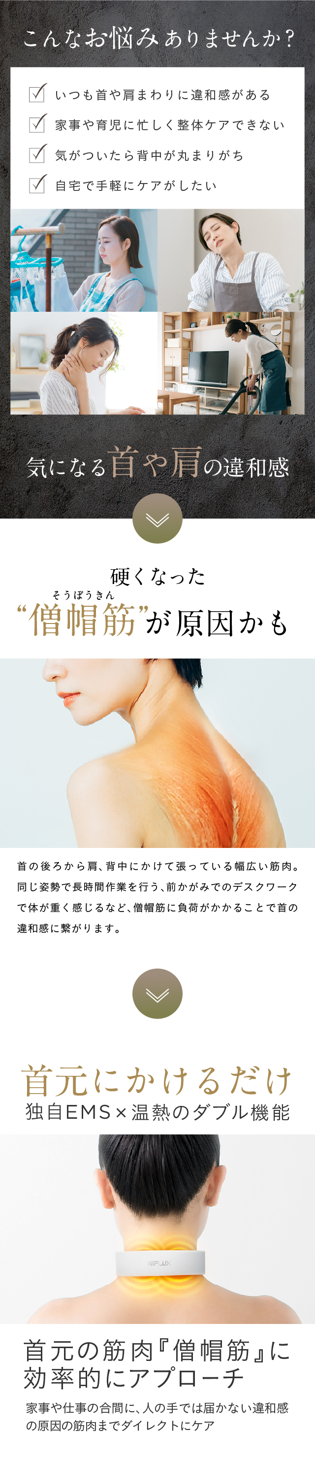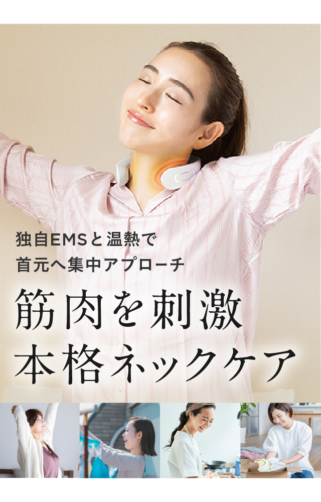 EMS電気刺激が普段あまり動かさない筋肉の奥深くまで刺激し首や肩の緊張を和らげます。