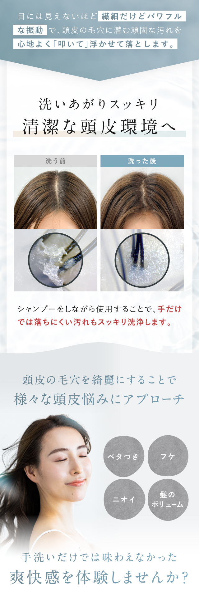 密着度を高めるブラシ部分と頭皮をギュッと寄せ上げる動きがまるでサロンでヘッドスパをしてもらっている感覚を実現。