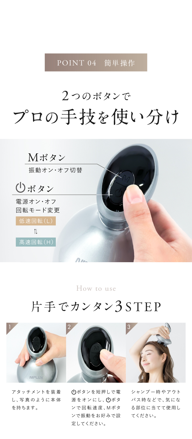 ボタンは2つだけなので、操作はとても簡単。スピードと振動モードを切り替えることができ、お好みのモードで、毎日の頭皮ケアに最適です。