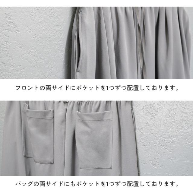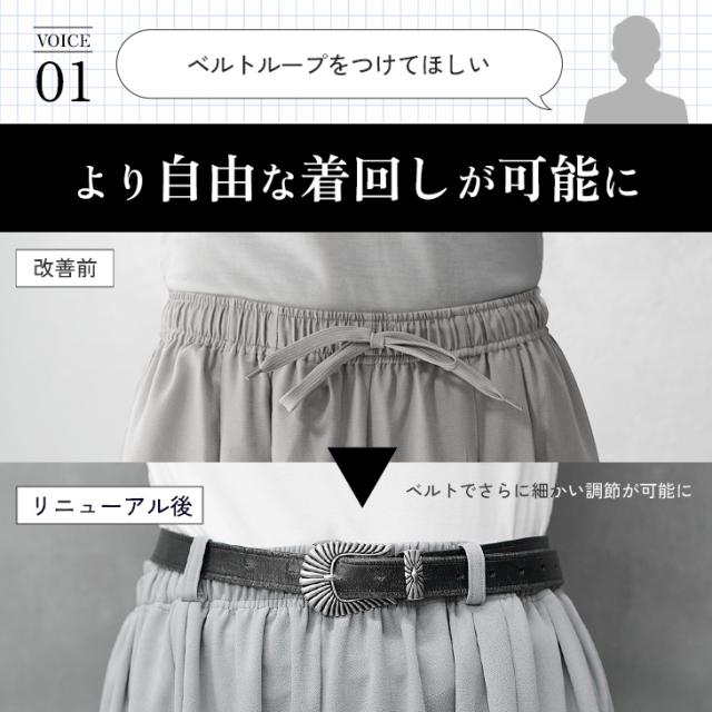 股下の境目をあいまいにすることでモードな雰囲気抜群なアイテムに。さらにお客様の声を反映し、ウエスト調整ができるベルトループを追加。