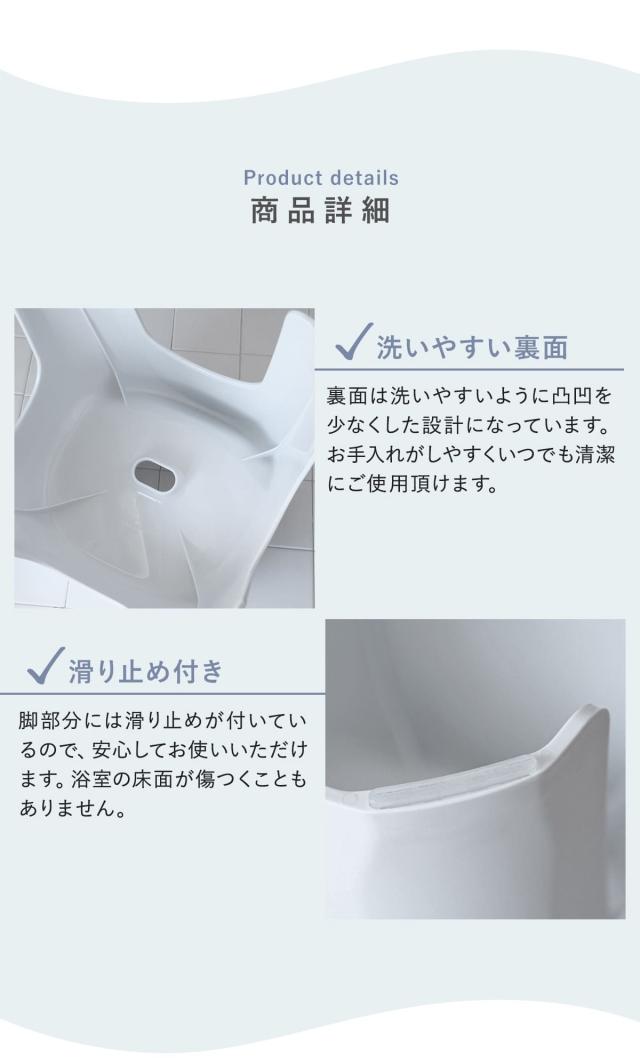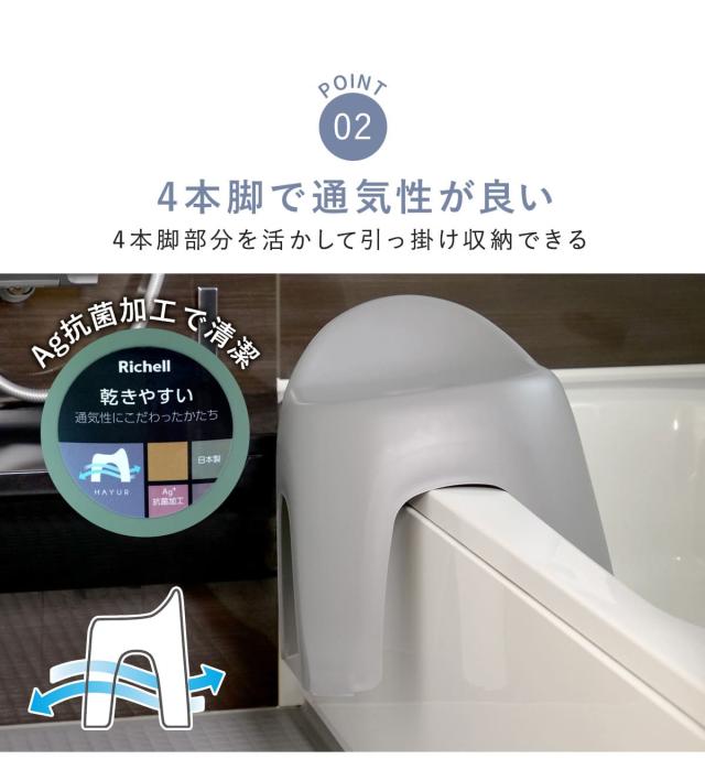 4方向から空気が流れやすい4本脚で、風呂椅子の内側に湿気がこもることを防ぎ素早く乾きます。さらに、抗菌効果のある銀イオンを配合しているので、いつでも清潔を保てます。ヌルヌルや臭いの発生が少なくなり快適!