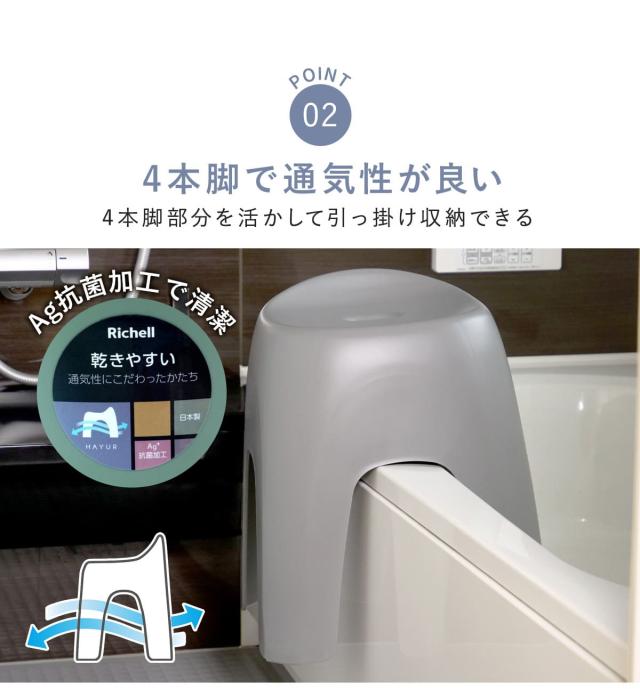 4方向から空気が流れやすい4本脚で、風呂椅子の内側に湿気がこもることを防ぎ素早く乾きます。さらに、抗菌効果のある銀イオンを配合しているので、いつでも清潔を保てます。ヌルヌルや臭いの発生が少なくなり快適!