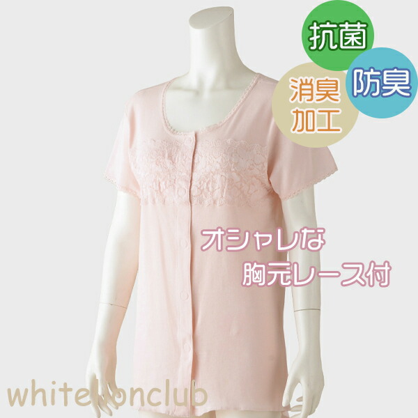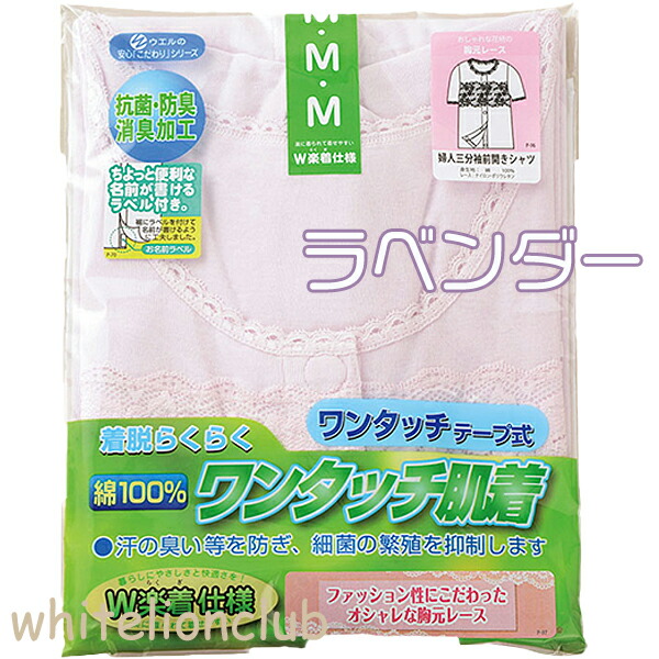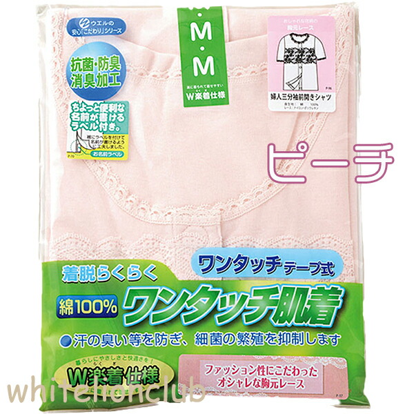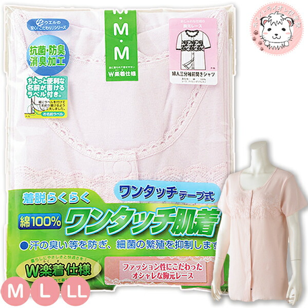 前開き 3分袖 ワンタッチテープ式 抗菌防臭 消臭 綿100% フロントレース M/L/LL | 介護 通院 レディース 綿 半袖 肌着 インナー