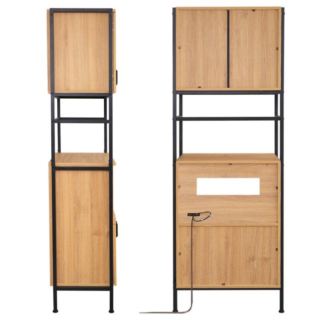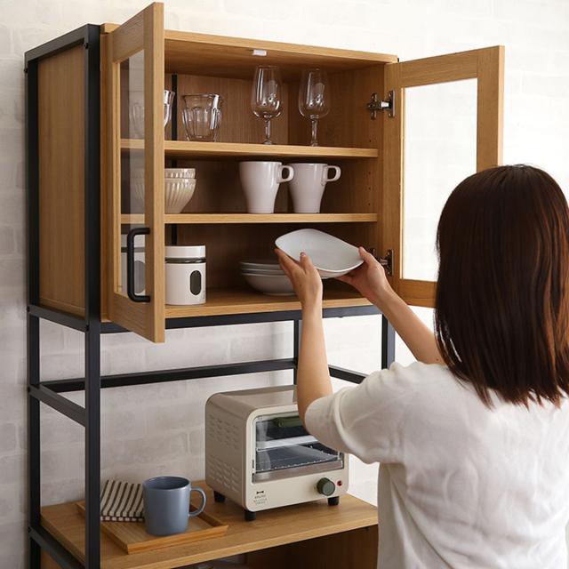 食器やキッチン家電、食品のストック類などをすっきりと収納できる、機能的な食器棚です。ナチュラルな木目調の表面材と、アイアンスチールの組み合わせが、キッチンをお洒落な雰囲気に演出してくれます。