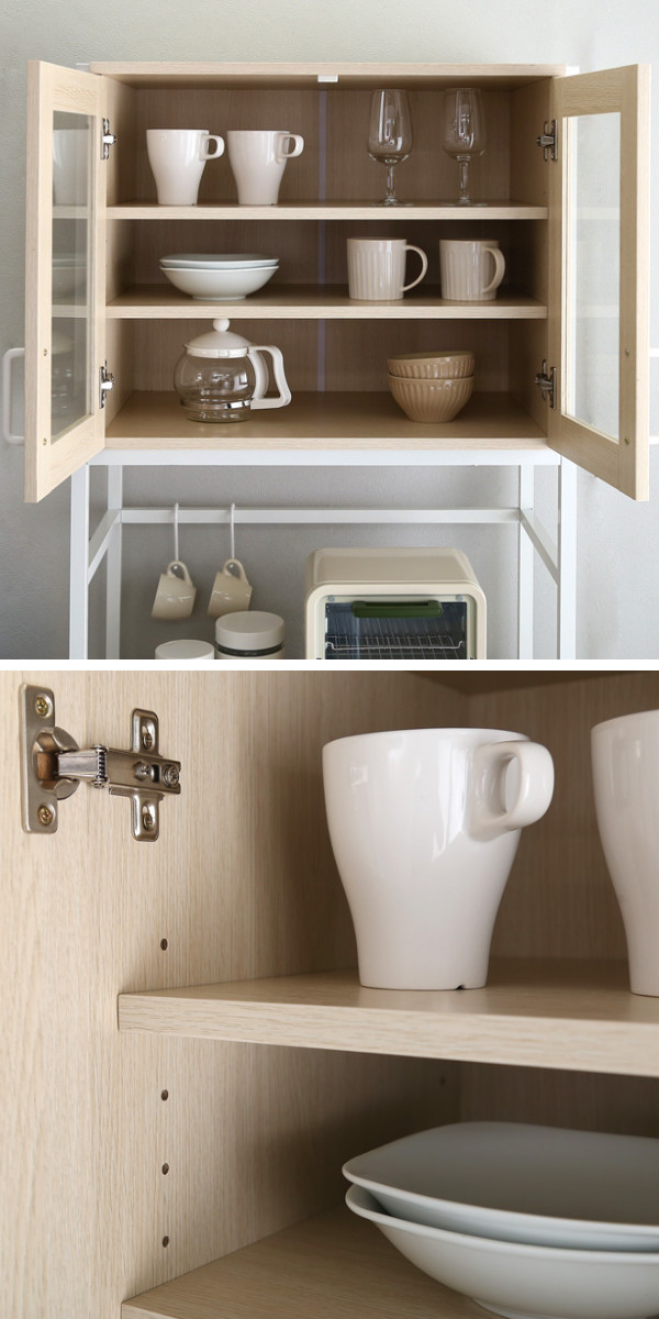 使いやすい開き戸で、物の出し入れがスムーズに行えます。扉には安全性を重視して、割れにくいクリアなガラスを使用しています。ガラスにより中の物が見えるので、お気に入りの食器などを、飾りながら収納するのも素敵です。