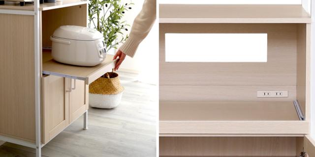 | サッと引き出せるスライド棚 滑らかなスライドレールで、炊飯器やポットを使う時も軽い力で、楽に出し入れできます。背板に通気穴があるので、熱や蒸気がこもる心配がありません。 | 2口コンセント付き 背板部分に便利な2口コンセントが付いています。(計1500W) |