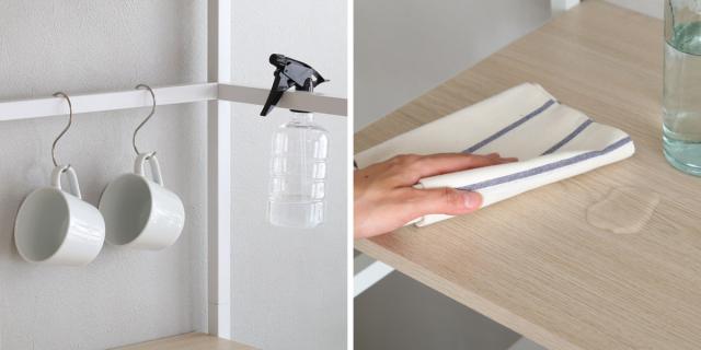 | 吊るす&掛ける収納 フレームに布巾を掛けたり、フックで小物を吊るすことができ、収納を便利にカスタマイズできます。 ※S字フックは付属していません | 水濡れに強い素材 アイアンスチール、木目部分のどちらも、水などが付いてもサッと拭くだけで、お手入れが簡単です。 |