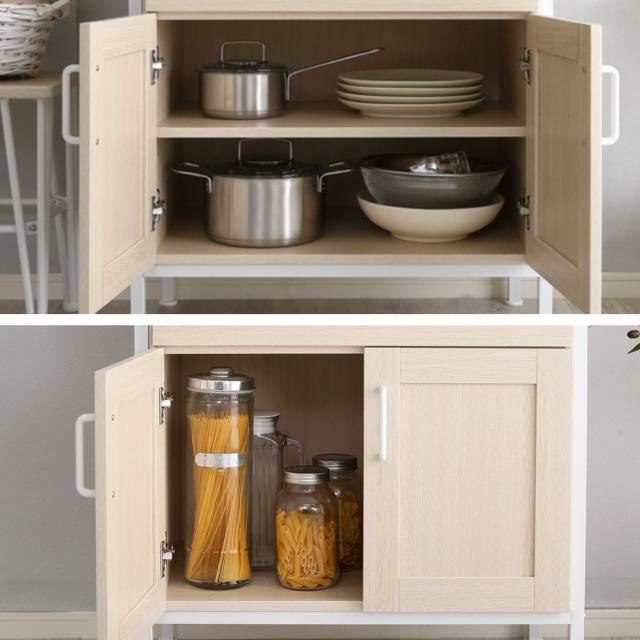 扉で中の物が見えないので、たくさん収納しても生活感を隠すことができます。下段は重い調理器具や食品ストックなどをまとめて入れるのにぴったりです。収納する物に合わせて高さ調整できる便利な可動棚付きです。