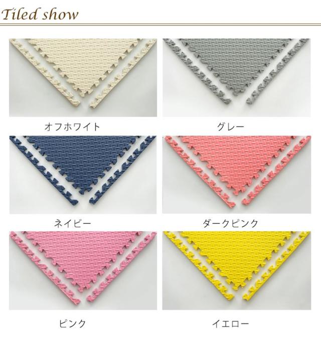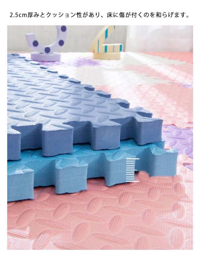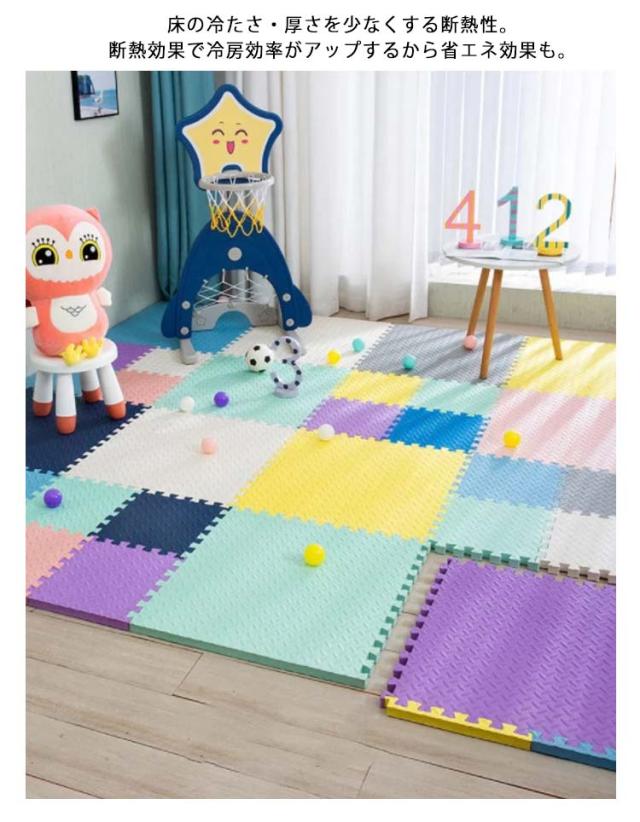 | 【極厚2.5cm】【大判60×60cm】【6畳/32枚セット】防音効果*保温性のあるプレイマット。 クッション性のあるEVA素材は防音効果や保温性があり、クッション効果で階下への騒音も抑えます。お子様のいるご家庭でも安心です。 2.5cm厚みとクッション性があり、床に傷が付くのを和らげます。 床の冷たさ・厚さを少なくする断熱性。断熱効果で冷房効率がアップするから省エネ効果も。 防水性に優れているから、汚れてもサッと一拭きすればOK。 マットの表面には凸凹加工を施しているから滑りにくい。 軽いのでラグを敷くより扱いやすく、模様替えなども簡単。 マット1枚につき、2本のサイドパーツが付属。サイドパーツを使えば、すき間なく敷き詰められるから、ゴミが溜まりにくくキレイな仕上がりに。 60*60*2.5cm 単色16枚set サイドパーツ付き、豊富なテクスチャとカラーで組み合わせ自由自在。 | |