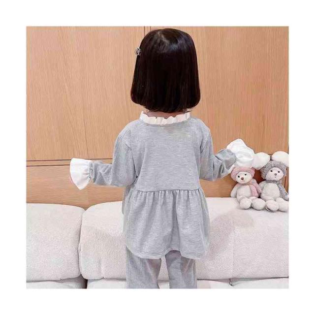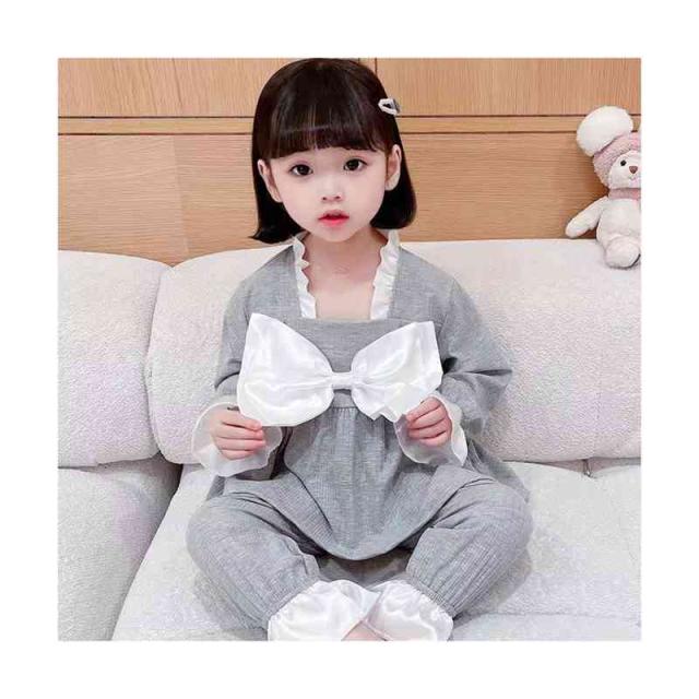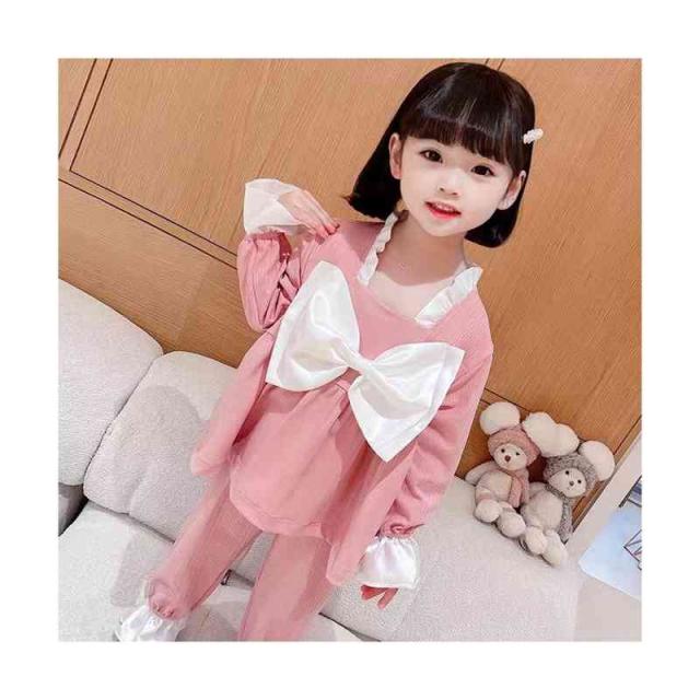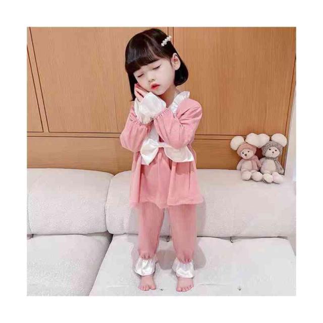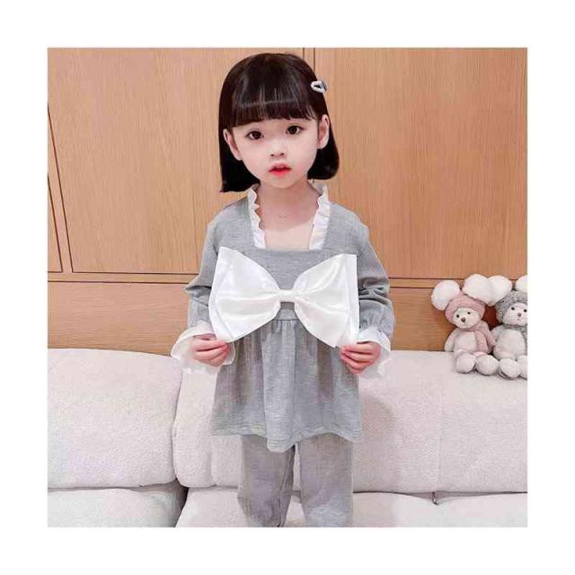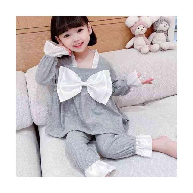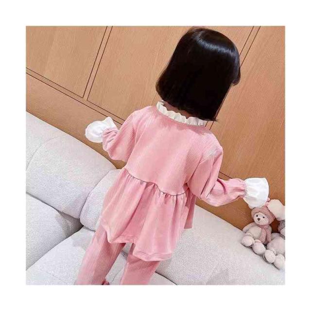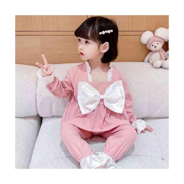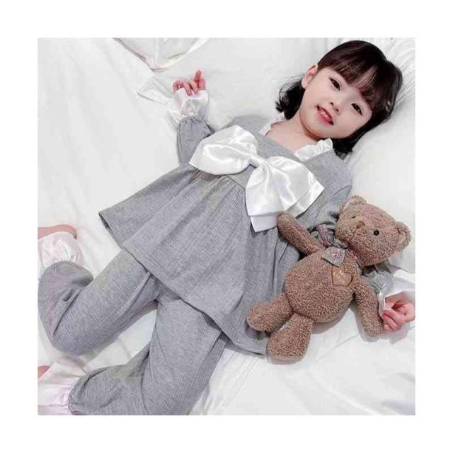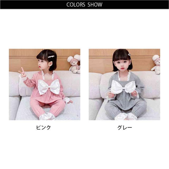 ルームパジャマ キッズ セットアップ 折襟 二点セット 部屋着 上下セット リボンパジャマ 春秋 パジャマ 長袖 カジュアル 寝巻き リボン付き 子供服 フリル パジャマ 女の子 ルームウエア 送料無料 ロングパンツ 無地 シンプル フリルパジャマ