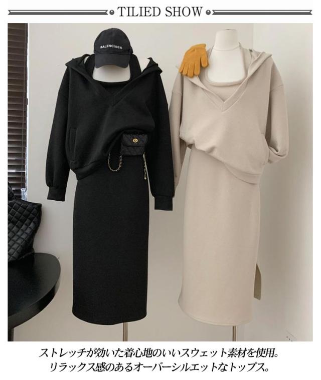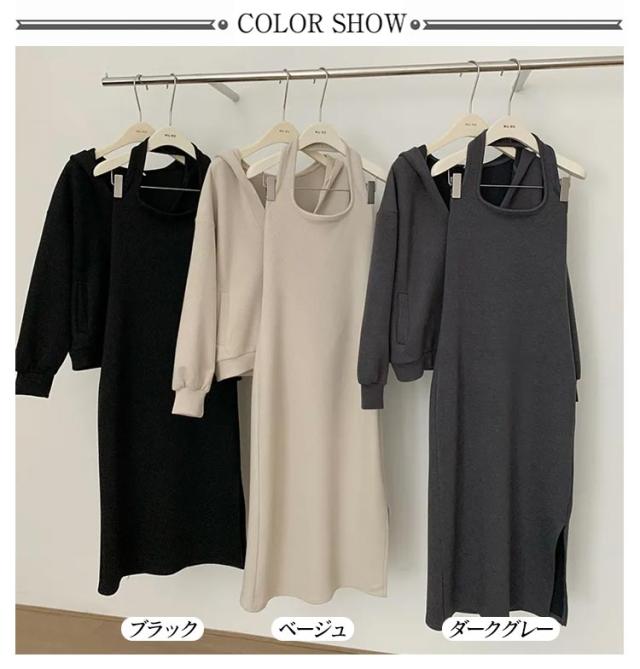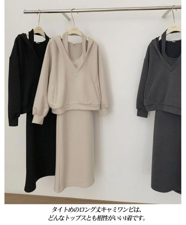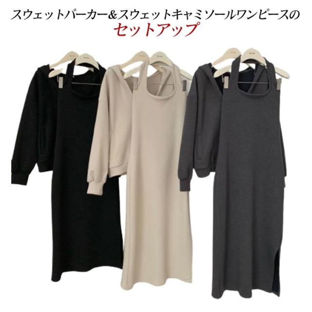 キャミソールワンピース サイドスリット ロング ワンピース プルオーバーパーカー キャミワンピ 長袖 スウェット 2点セット スウェットワンピース ノースリーブ ロングワンピース セットアップ ボリューム袖 トップス