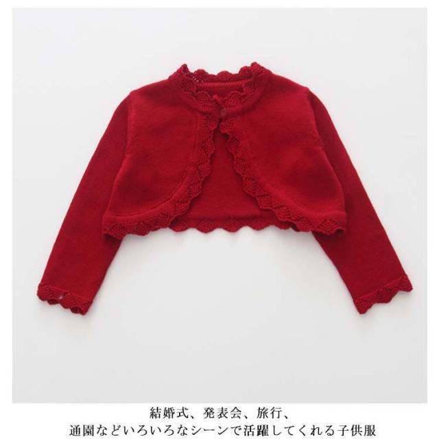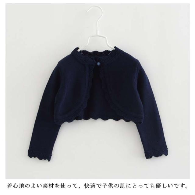 | 上品なデザインで大活躍してくれるカーディガンはマストアイテム! 着心地のよい素材を使って、快適で子供の肌にとっても優しいです。 ショート丈のボレロ仕様なので、フォーマルドレスやワンピースと相性抜群! 着替えも楽ちんで毛玉になりにくく、着心地も抜群なのも特徴です。 結婚式、発表会、旅行、通園などいろいろなシーンで活躍してくれる子供服 | |
