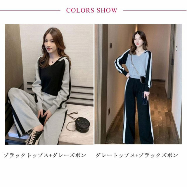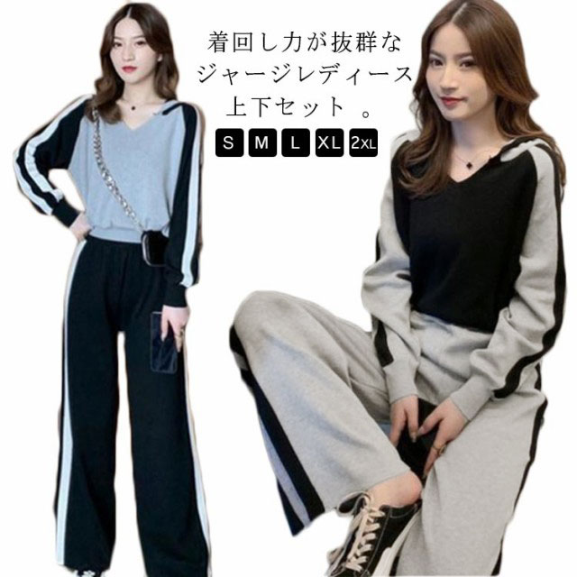 きれいめ ジャージ パーカー パンツセット レディース おしゃれ ハイウエスト カジュアル グレー ジャージ ワイドパンツ ブラック Vネック 黒 セットアップ 20代 30代 レディース