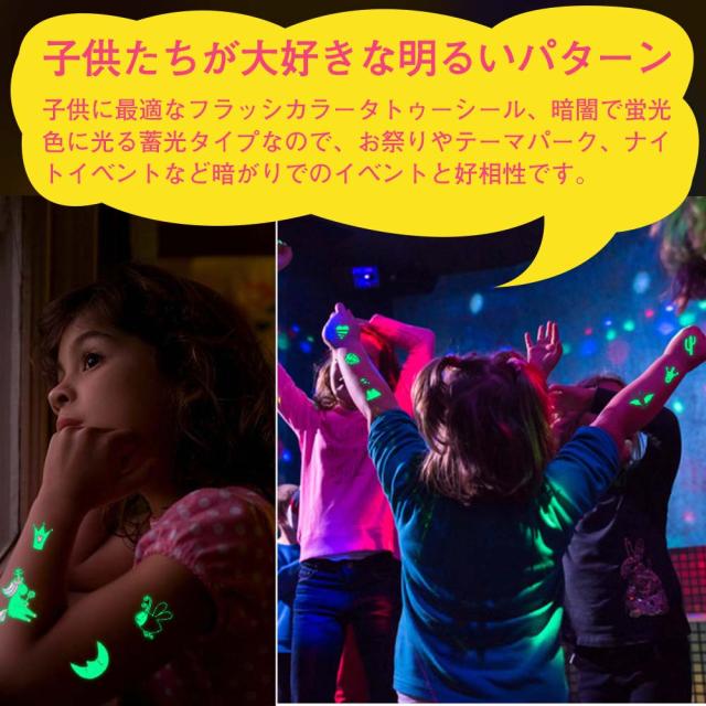 ●子供に最適なフラッシカラータトゥーシール、暗闇で蛍光色に光る蓄光タイプなので、お祭りやテーマパーク、ナイトイベントなど暗がりでのイベントと好相性です。