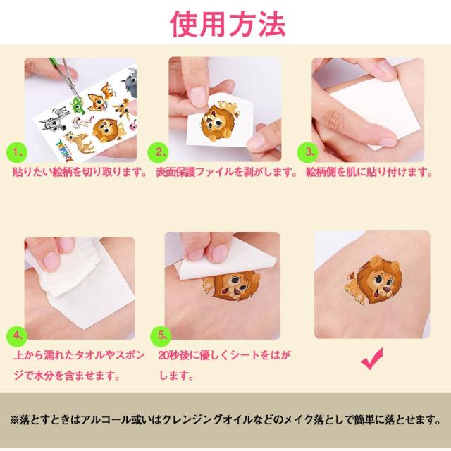 剥がし方法:少量の化粧落としやベビーオイルをタトゥーシールに塗って、10〜20秒後、優しく拭き取ります。