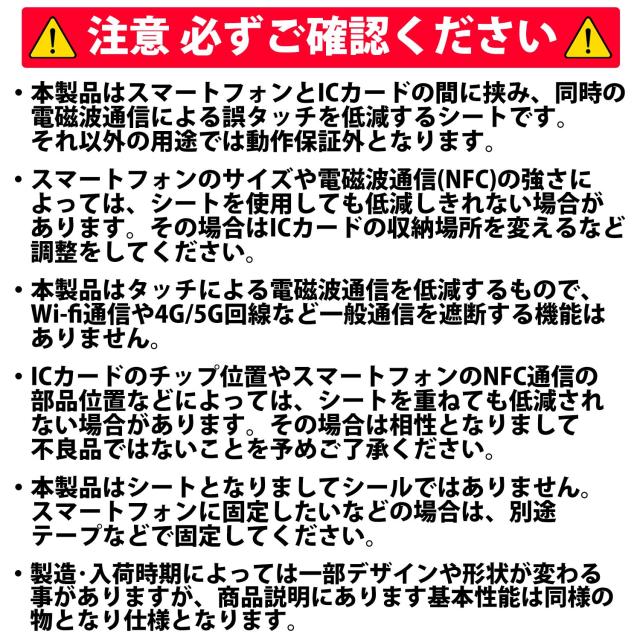 ・本製品はスマートフォンとICカードの間に挟み、同時の電磁波通信による誤タッチを低減するシートです。それ以外の用途では動作保証外となります。