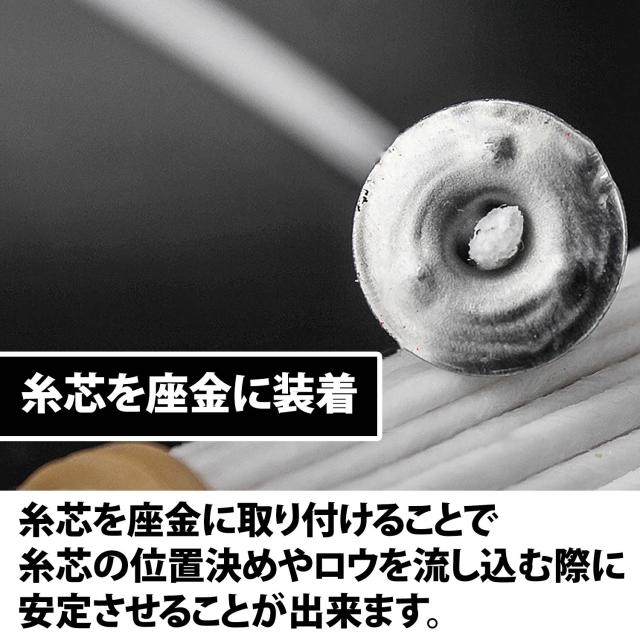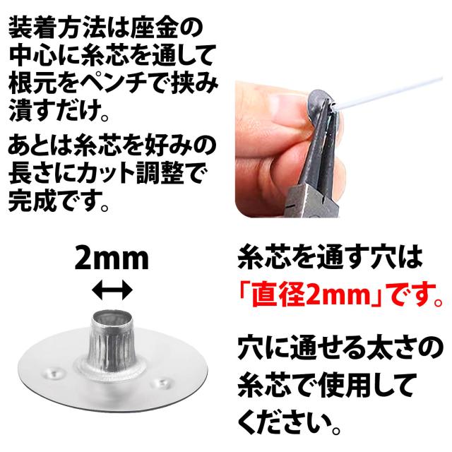 ・一度糸芯を取り付けて根元を潰すと元に戻せません。きちんと糸芯が穴にはまっているか確認をしてから根元を挟んで潰し固定してください。