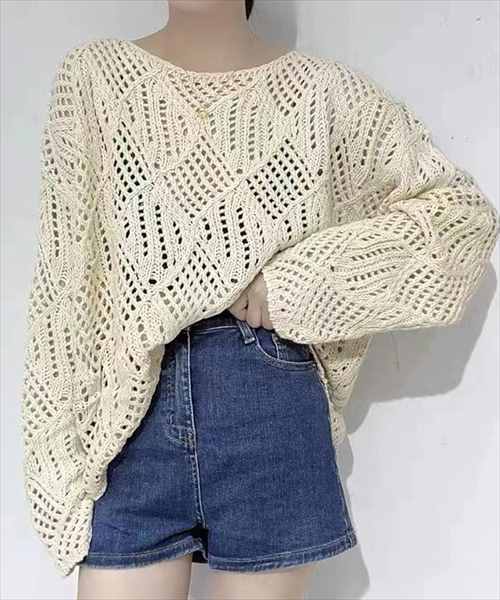 レディース ドロップショルダー透かし編みニットセーター