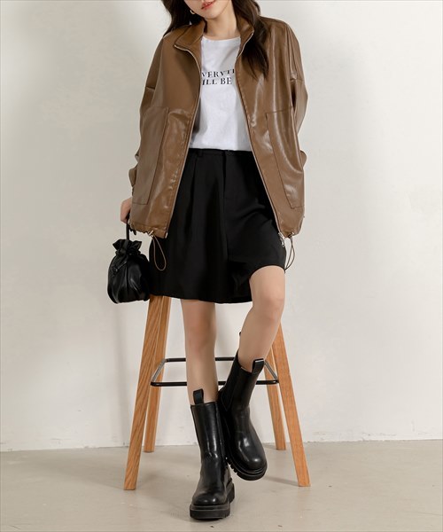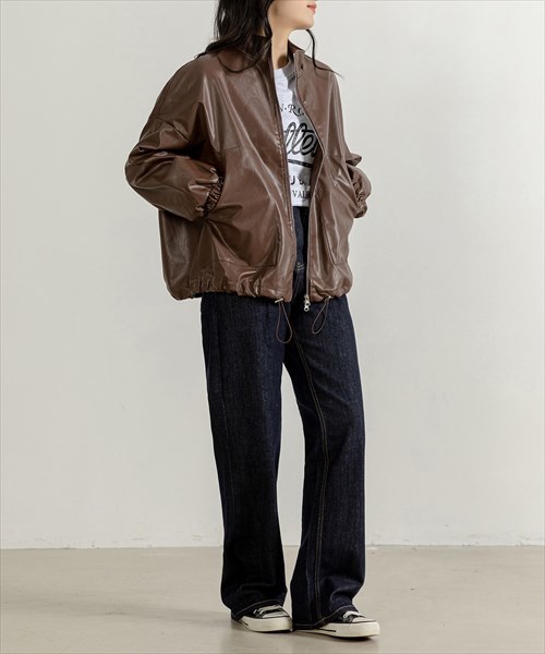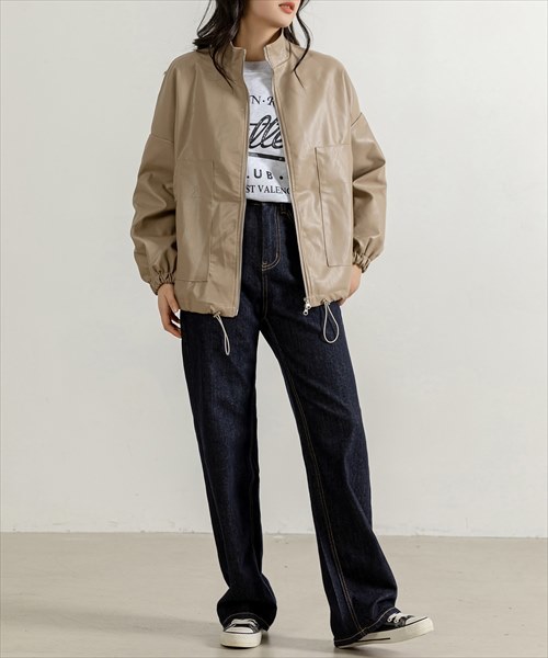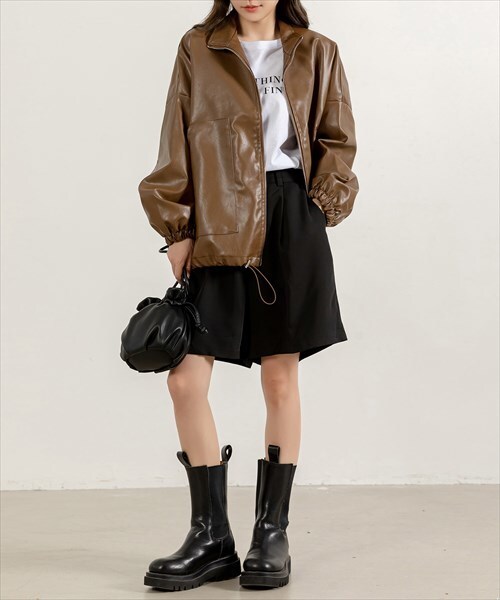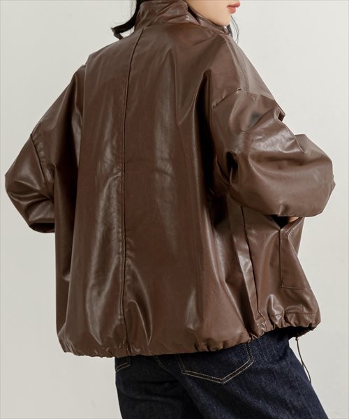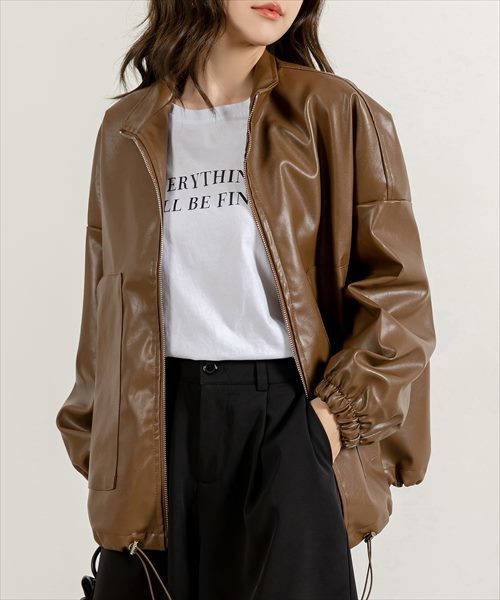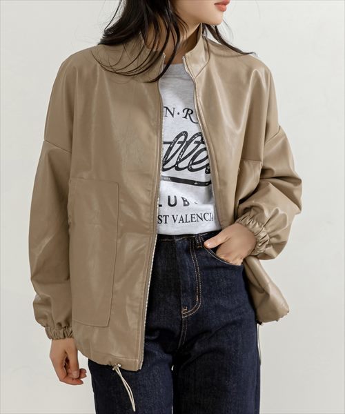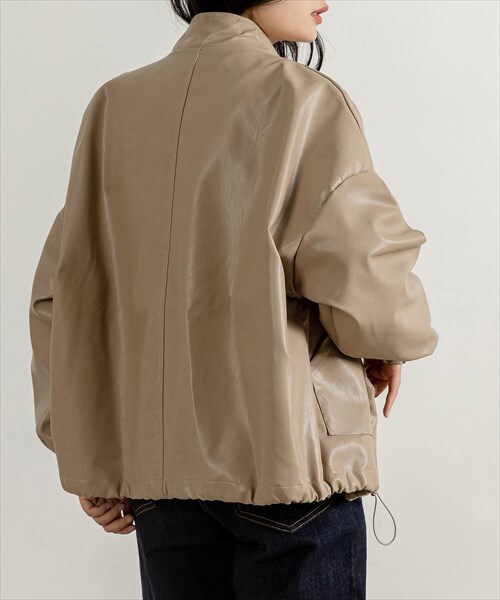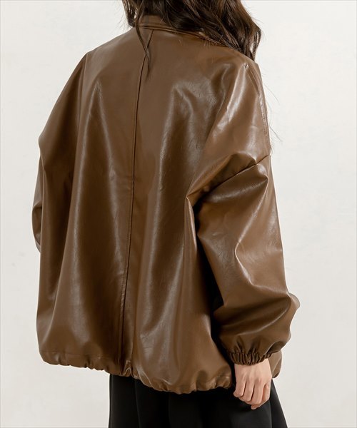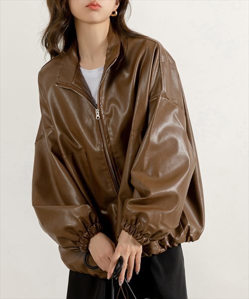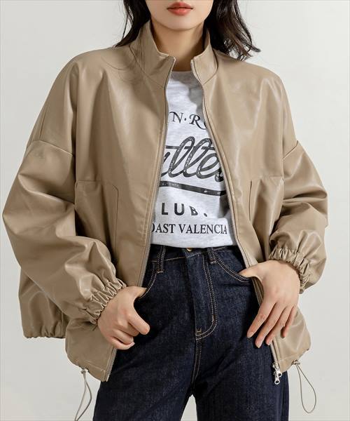 レディース バルーンスリーブフェイクレザーライダースジャケット