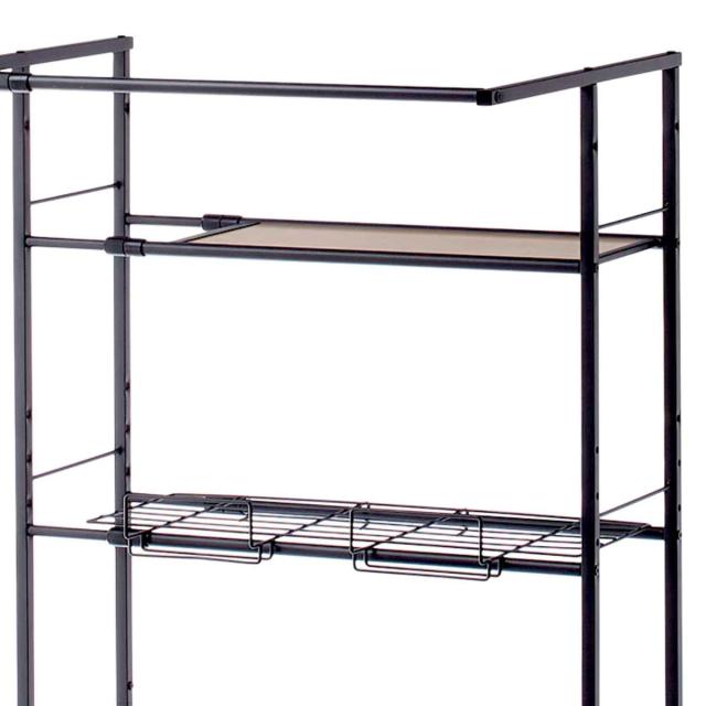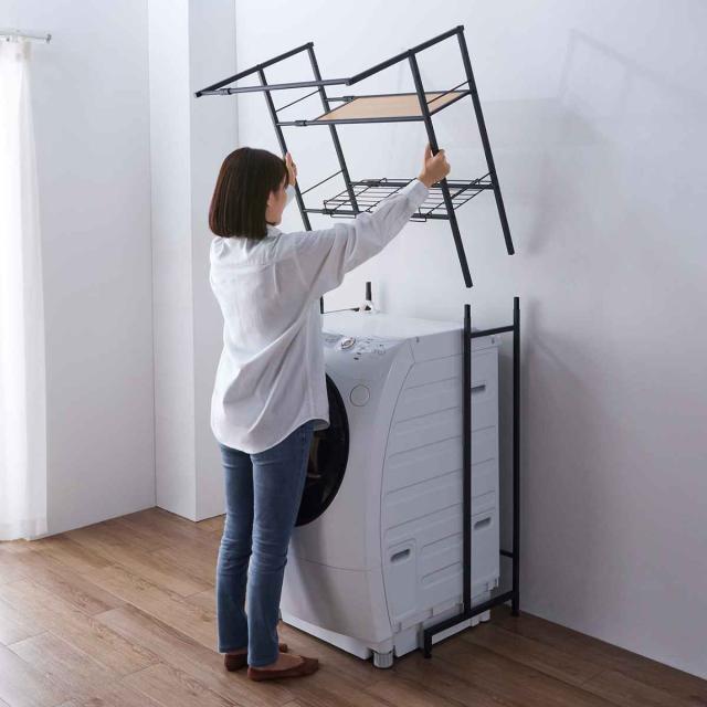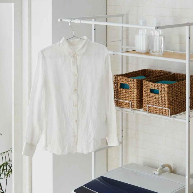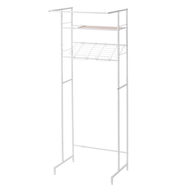 タオルやハンガーなどを掛けておくのに最適なハンガーバー付きです。洗濯物をサッと一時掛けしておくことが可能なので重宝します。また2段の棚で洗濯機の上の空間を有効活用できるので収納力がアップします。棚位置が高く、洗濯機のふたの開閉もスムーズです。