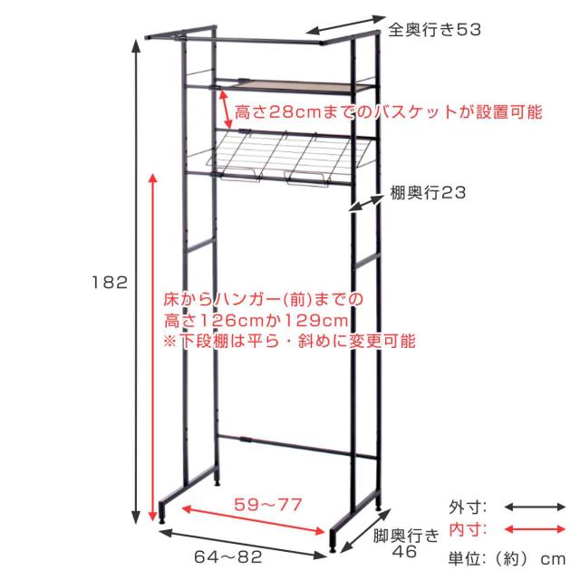 ランドリーラック 洗濯機ラック バスケット台付き ( 伸縮 ランドリー 収納 洗濯機 ラック 洗面所収納 ランドリー収納 棚 洗濯機棚 バスケット台 可動棚 )