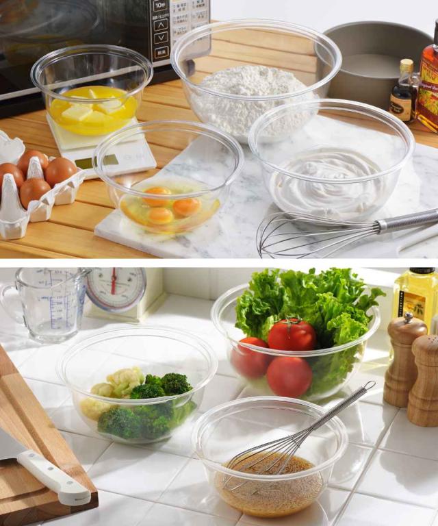 ガラスのように透明でありながら、落としても割れたりカケたりしにくい丈夫なボウルです。軽くて扱いやすく、食材もこぼれにくい深さがあるので、混ぜたり和えたりしやすいです。