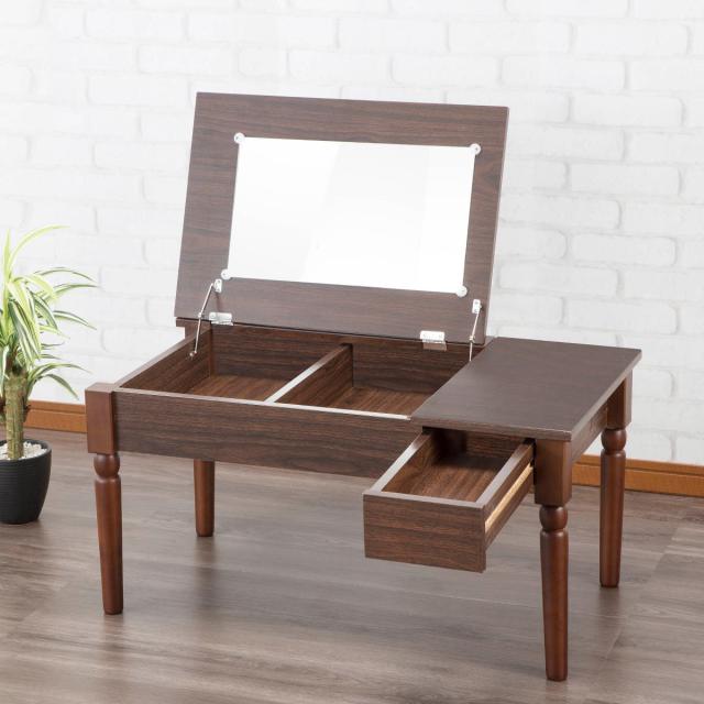 テーブルの天板を開けるとドレッサーに早変わりする収納力抜群のコスメテーブルです。普段はテーブルとして、メイクなど身支度を整える際にはドレッサーとして使えます。1台で2通りの使い方ができるので、狭いお部屋でも省スペースで憧れの空間を作ることができます。