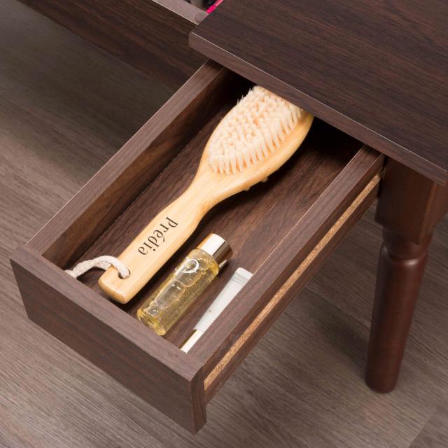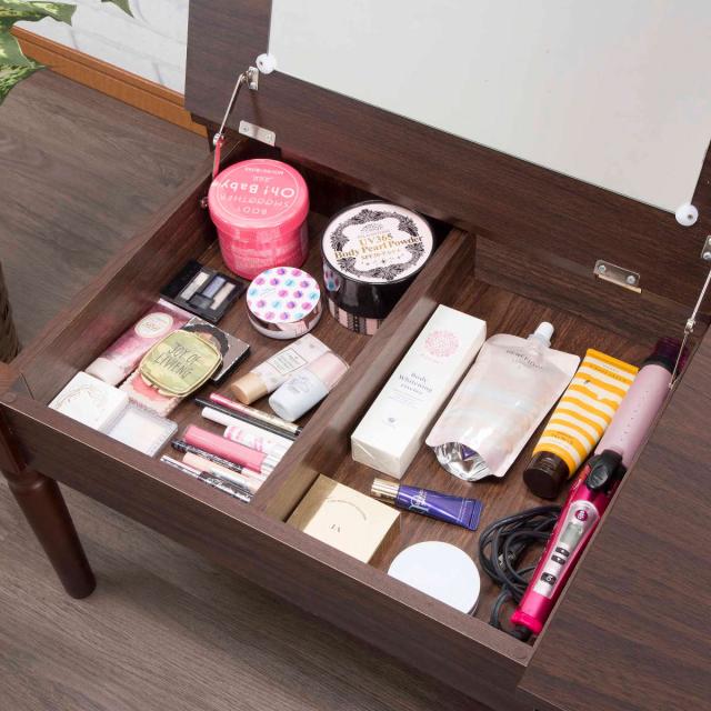 天板の中にはコスメ類はもちろん、ドライヤーや身だしなみグッズが置ける収納スペースがあります。また、ブラシなどの細かい小物を入れる事のできる便利な引き出し付きです。