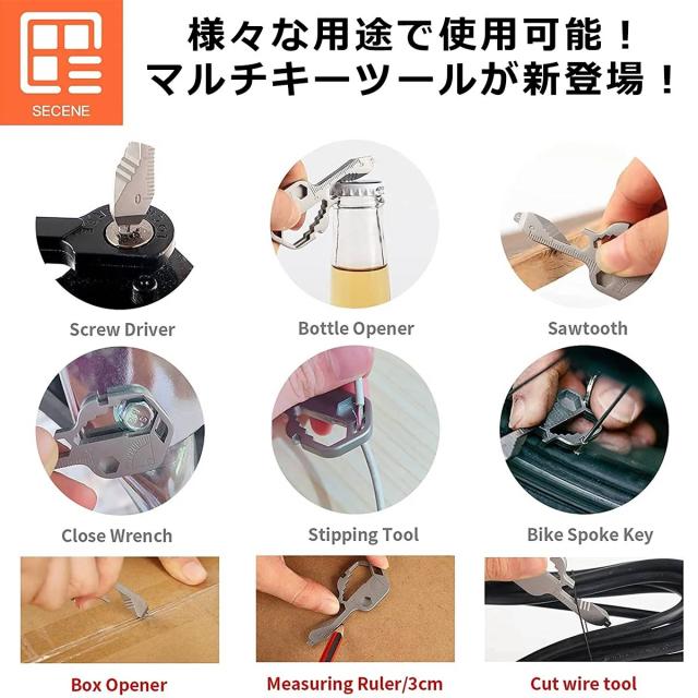 キーツール マルチツール キャンプ アウトドア キーホルダー ボックスカッター ダンボールカッター カッター 栓抜き ボトルオープナー ワイヤーカッター ノコギリ ヤスリ ドライバー 定規 角度定規 ストリッピングツール 六角レンチ ベンディング バイクレンチ