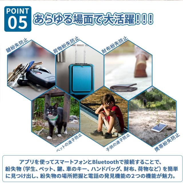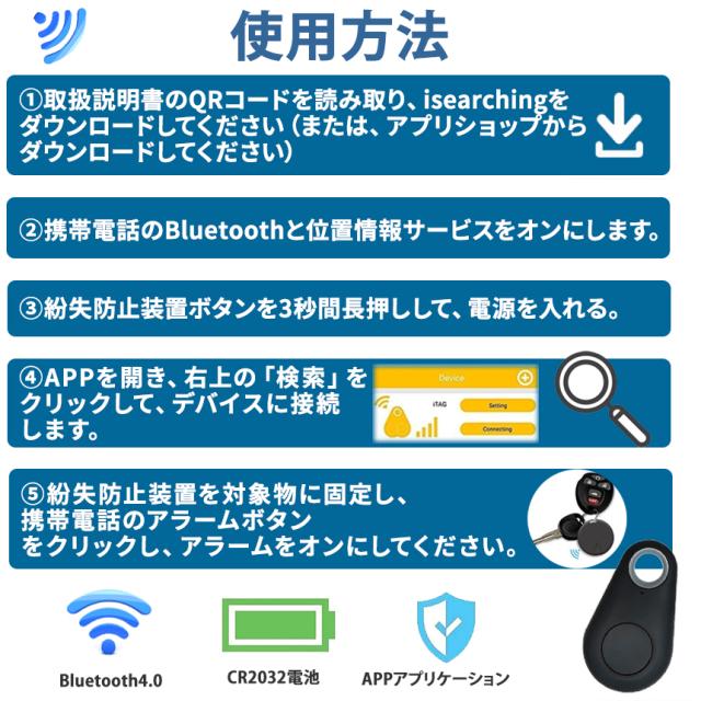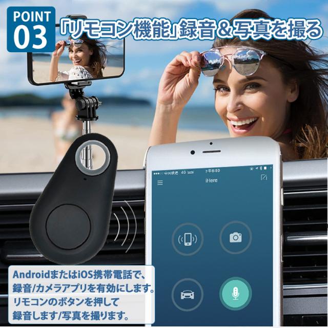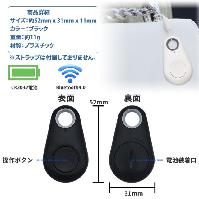 【商品説明】\失くしものがすぐ見つかる!/ スマートフォンとこの探し物発見器をBluetoothで接続することで、紛失物(ペット、鍵、車のキー、ハンドバッグ、財布、荷物など)を簡単に見つけ出し、リモコン機能も搭載し、スマートフォンのカメラを遠隔で操作することができます♪◆双方向検索この探し物発見器は、鍵やペット、財布などを追跡するだけでなく、接続している携帯電話の探索にも利用できます。 スマートフォンが見つからない場合は、探しもの発見器のボタンをダブルクリックすると、マナーモードにしていても、鳴動して位置情報を知らせます。◆切断位置記録アプリは、携帯電話と探し物発見器が最後に切断された場所を記録します。◆スマート紛失防止アラームスマホとトラッカーの距離が離れ、切断されると同時にアラートが鳴ります。【商品仕様】サイズ:約52mm x 31mm x 11mmカラー:ブラック重量:約11g材質:プラスチック電池:CR2032電池1個(内蔵)付属品:日本語説明書×1※ストラップは付属しておりません。※輸入品ですので多少の臭いやスレ傷、汚れはご了承ください※詳細は画像にてご確認ください