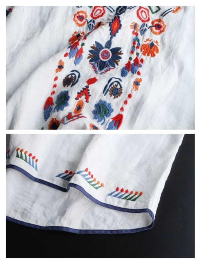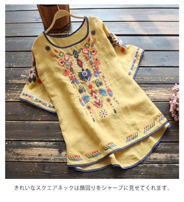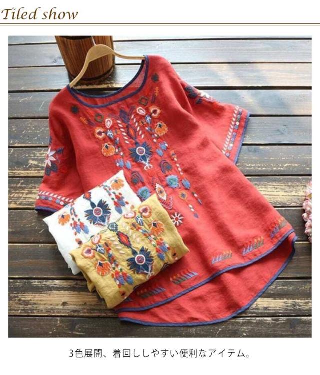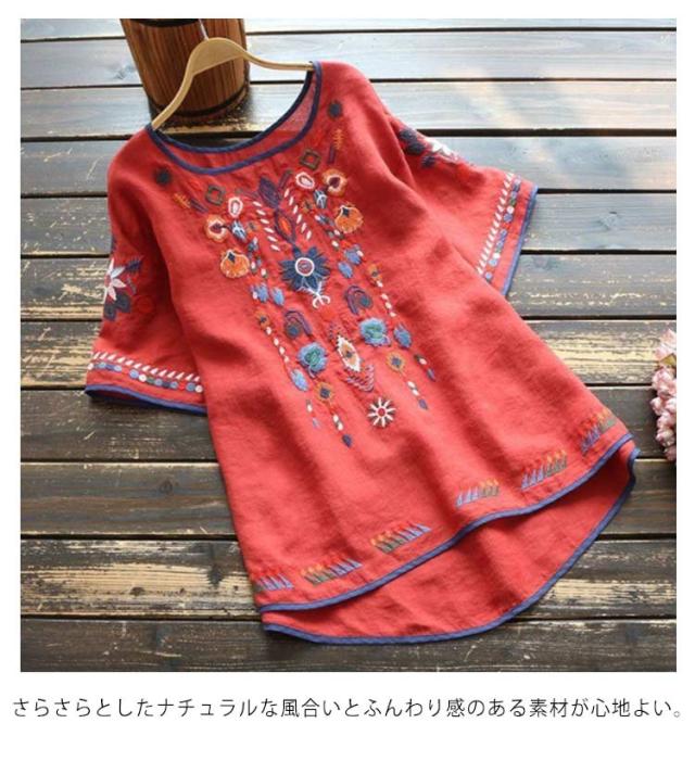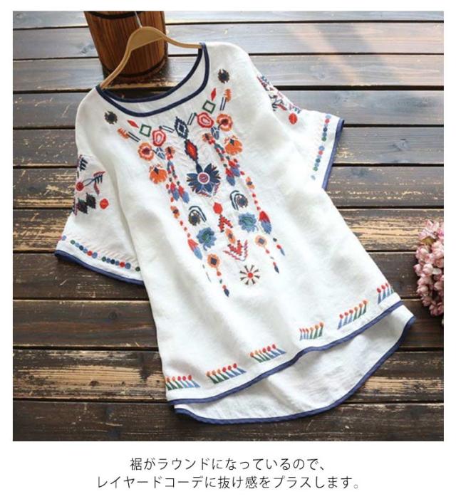 ブラウス レディース 半袖 Tシャツ トップス 花柄刺繍 半袖シャツ アジアン エスニック ラウンドテール レディース プルオーバー 薄手 カットソー 春 夏 ナチュラル きれいめ M L XL 2XL 3XL 4XL
