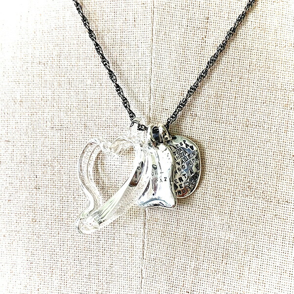 ガラスのハート(ハンドメイド)と刻印チャームを2つ組み合わせたペンダント。刻印チャームの刻印はスペイン語で”愛、勇気、希望、平和。