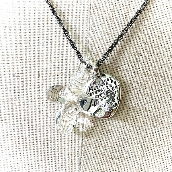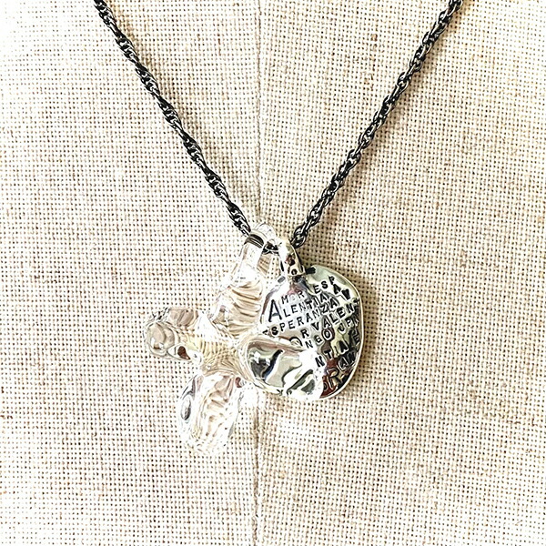 ガラスのリーフ(クロスにも見えるリーフ・ハンドメイド)と刻印チャームを組み合わせたペンダント。チャームの刻印はスペイン語で”愛、勇気、希望、平和。
