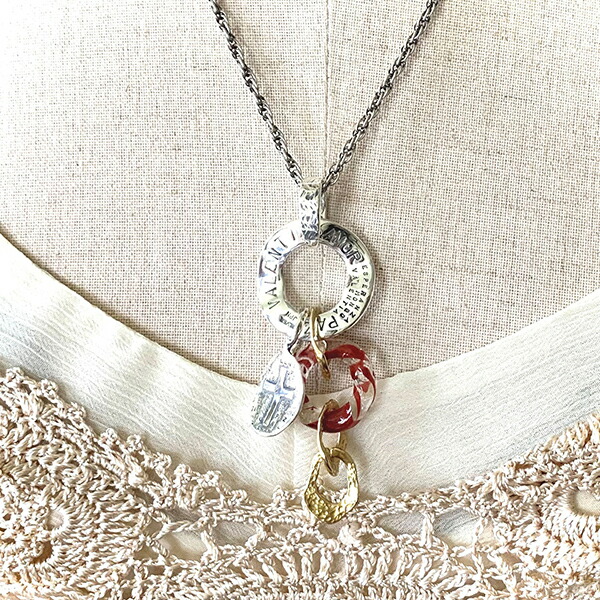シンプルなオリジナルパーツの組み合わせで、存在感を存分に引き出したデザインペンダント。それぞれのパーツが独立していて、全てに動きが出る。打ち込まれた文字はスペイン語で愛、勇気、希望、平和の文字で、新しい状態で綺麗に手入れをしながら重厚なシルバーの光を楽しんでも良いし、そのまま使い古した雰囲気になっても落ち着いたまとまりに時間と共になる事を考えて作られた、愛用者の好みで先々の雰囲気が変わる楽しみがあるペンダント。連結されたオリジナルパーツはメンテナスを計算された構造になっている。
