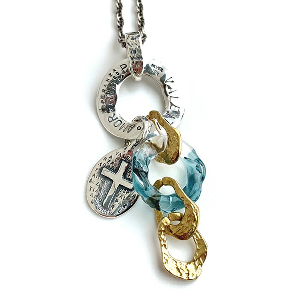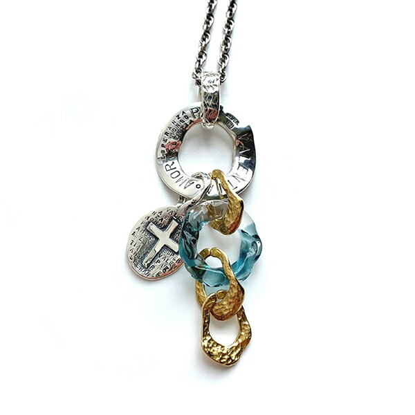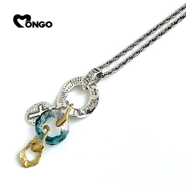 MONGO シルバー & ガラス リング ネックレス チェーン付き ブルーグリーン シルバー ペンダント シルバーネックレス クロス メンズ レディース