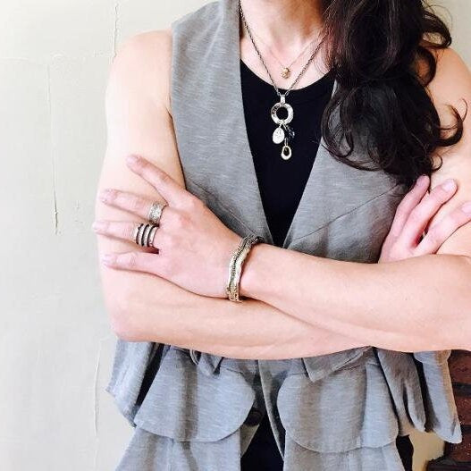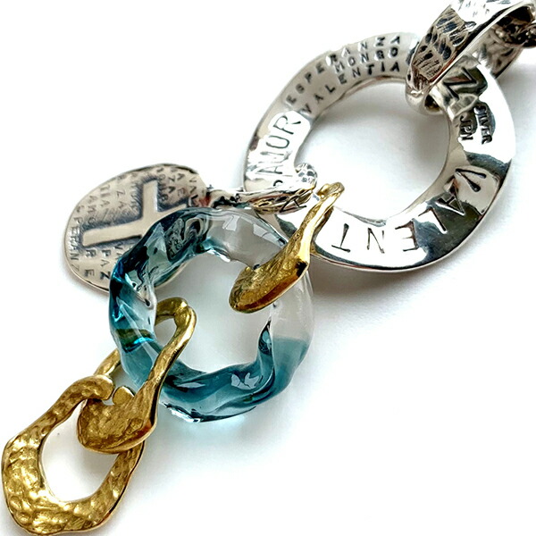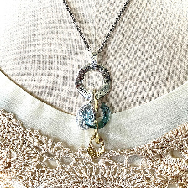 シンプルなオリジナルパーツの組み合わせで、存在感を引き出したデザインペンダント。それぞれのパーツが独立していて、全てに動きが出る。打ち込まれた文字はスペイン語で愛、勇気、希望、平和の文字で、新しい状態で綺麗に手入れをしながら重厚なシルバーの光を楽しんでも良いし、そのまま使い古した雰囲気になっても落ち着いたまとまりに時間と共になる事を考えて作られた、愛用者の好みで先々の雰囲気が変わる楽しみがあるペンダント。連結されたオリジナルパーツはメンテナスを計算された構造になっている。